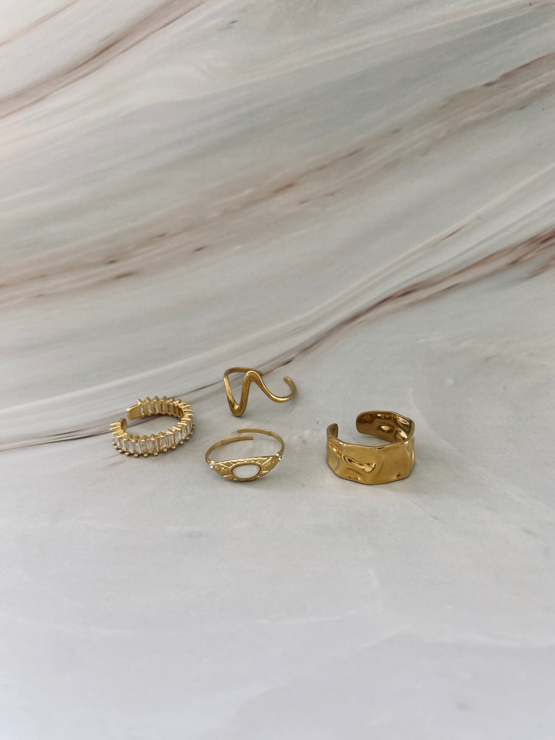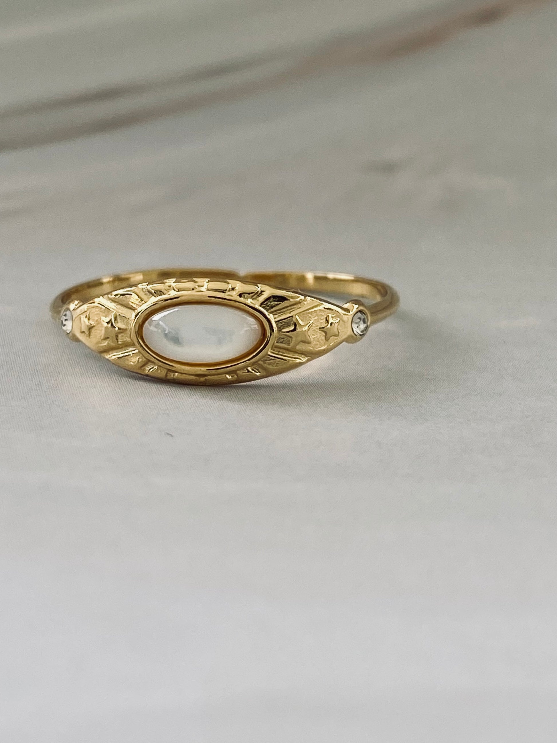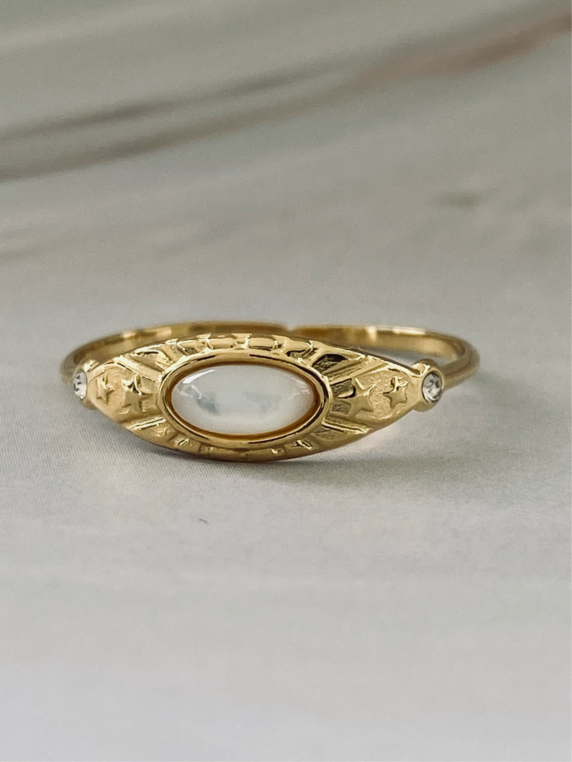 Indulge in luxury with the Bronya Tarnish Free Gold Ring. Made with high quality stainless steel, this ancient-style ring is gold plated for a timeless look. Set withba stunning natural stone, making it a stylish investment. Elevate your style with this exquisite piece. Waterproof and tarnish free.