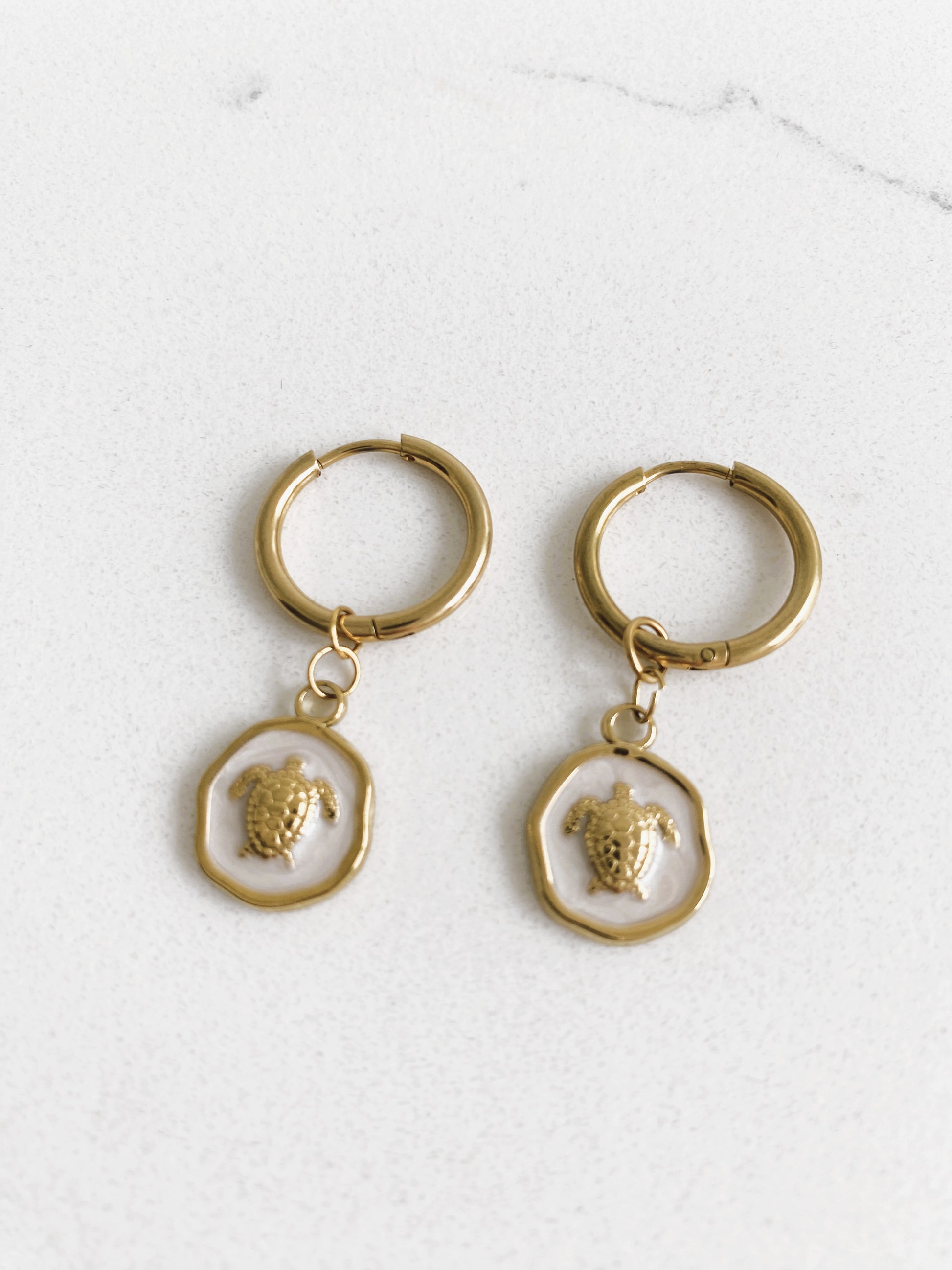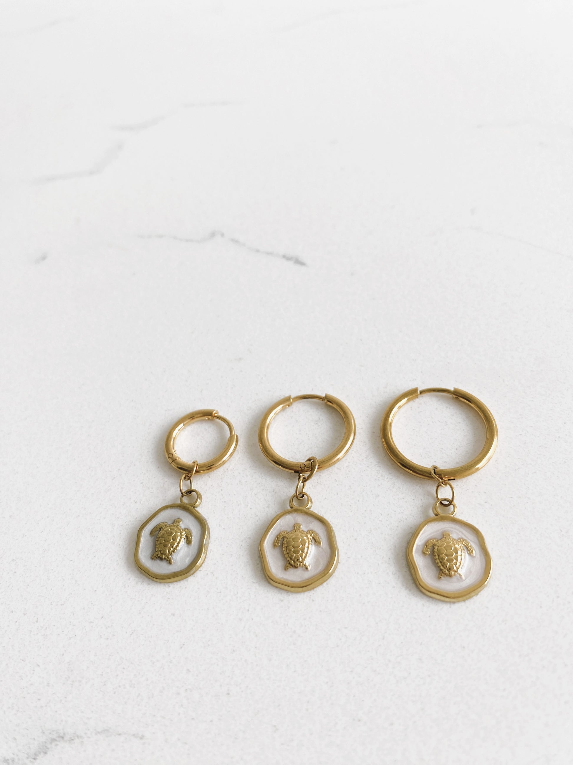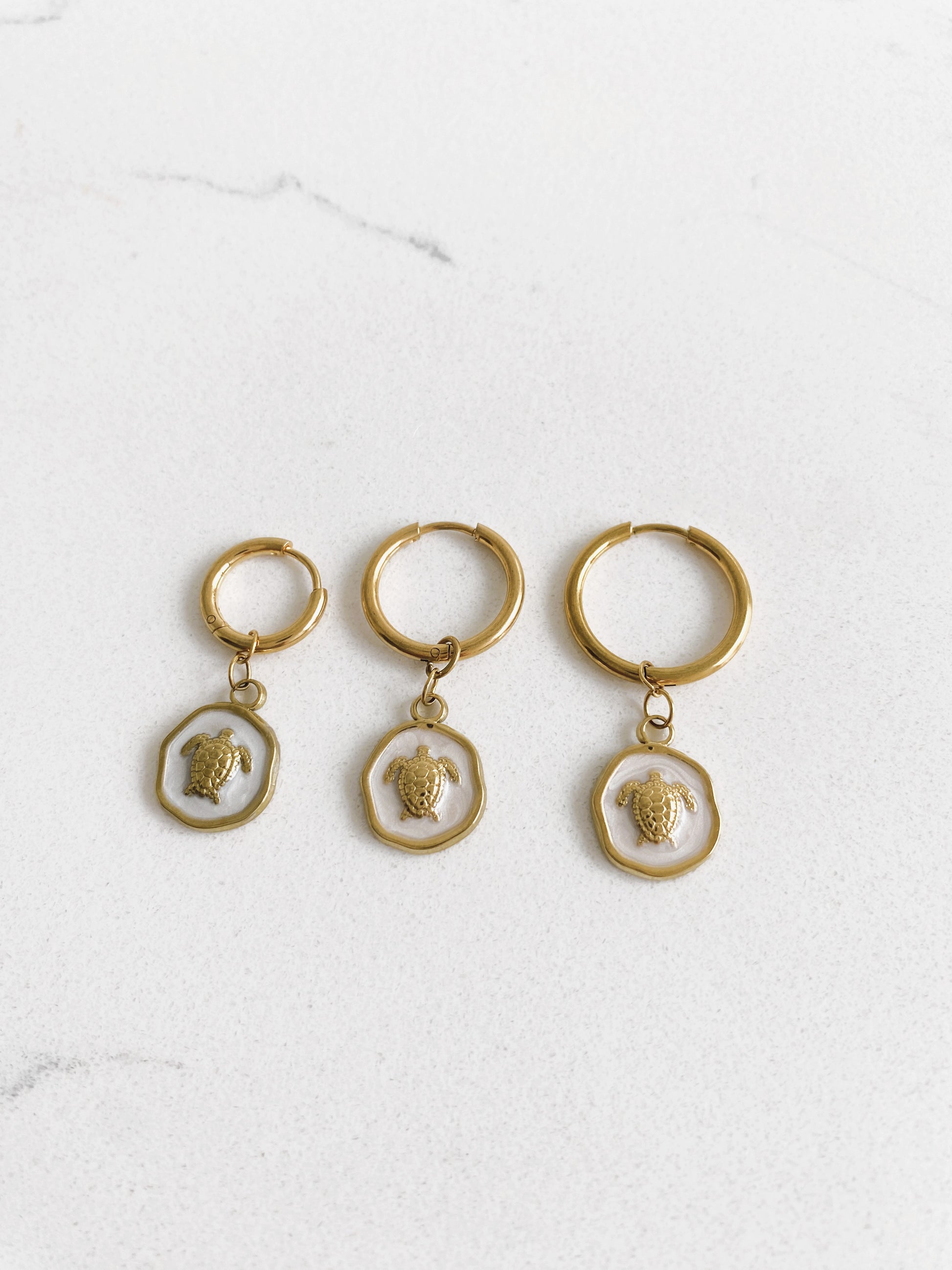 These lovely sea turtle earrings, available in small, medium, and large hoops, symbolize wisdom, patience, and resilience. They remind you of your connection to home while offering a meaningful touch of protection and stability.