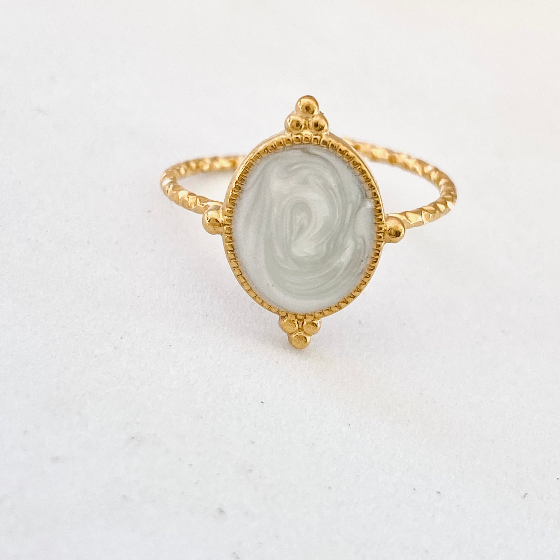 Add a touch of luxury to your everyday look with the Zion ring. Crafted to highlight the beautiful central feature, a lovely set marble look stone. This adjustable piece is plated in PVD 18K gold for lasting quality and resistance to tarnishing. Make a statement with the Zion ring.